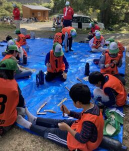 訪問した時は、昼食(飯ごう炊飯)後で、竹を削り、一生懸命に竹トンボを制作して